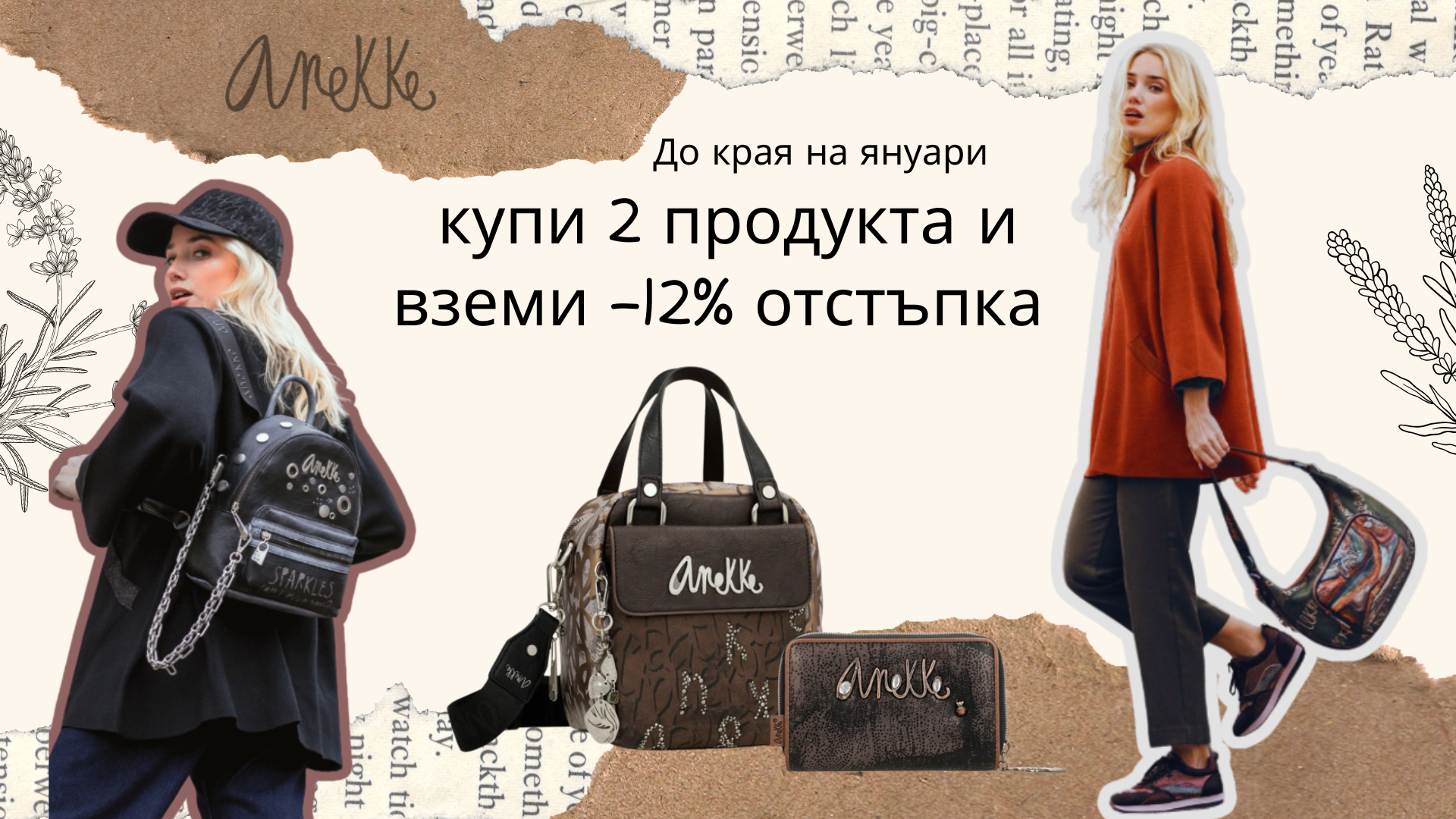 Anekke е една много специална марка и всяка нейна колекция има своя собствена история със свой отличителен стил. Зад марката Anekke се крие разнообразие от модни аксесоари, изработени от висококачествени екосоъбразни материали, сред които чанти, раници, чанти за лаптопи, портмонета, несесери, бижута, чадъри, химикалки и шалове.