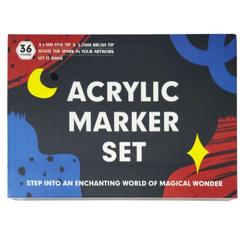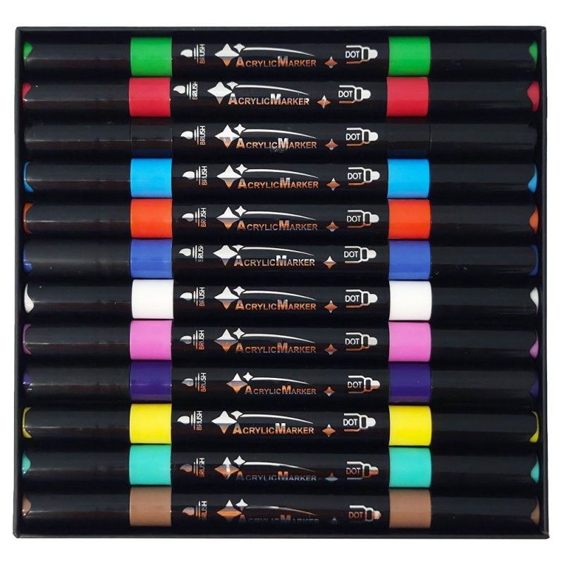 Комплект двувърхи акрилни маркери с фин връх (4.5 мм) и връх тип четка (3.2 мм). Предназначени са за рисуване и творчество, подходящи за деца и възрастни. С този комплект можете да рисувате върху всякакви повърхности като хартия, картон, дърво, пластмаса, метал и др. Цветовете са наситени, с лъскъв завършек, не избледняват и са устойчиви на влага.