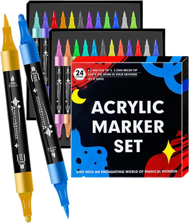 Комплект двувърхи акрилни маркери с фин връх (4.5 мм) и връх тип четка (3.2 мм). Предназначени са за рисуване и творчество, подходящи за деца и възрастни. С този комплект можете да рисувате върху всякакви повърхности като хартия, картон, дърво, пластмаса, метал и др. Цветовете са наситени, с лъскъв завършек, не избледняват и са устойчиви на влага.
