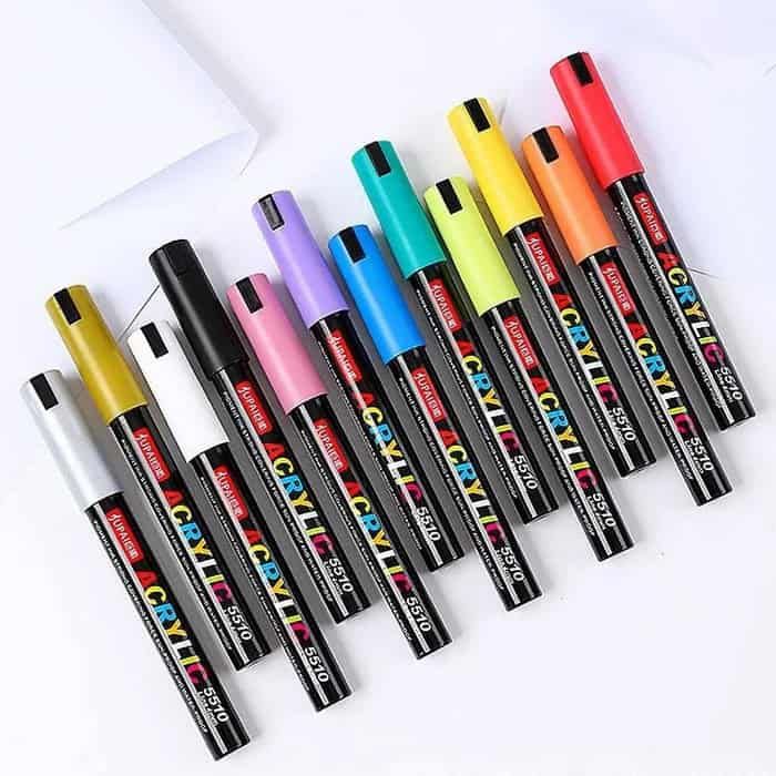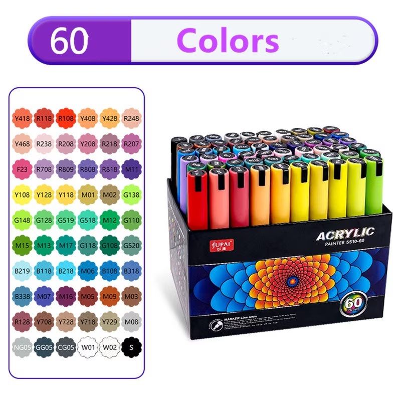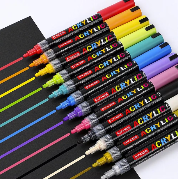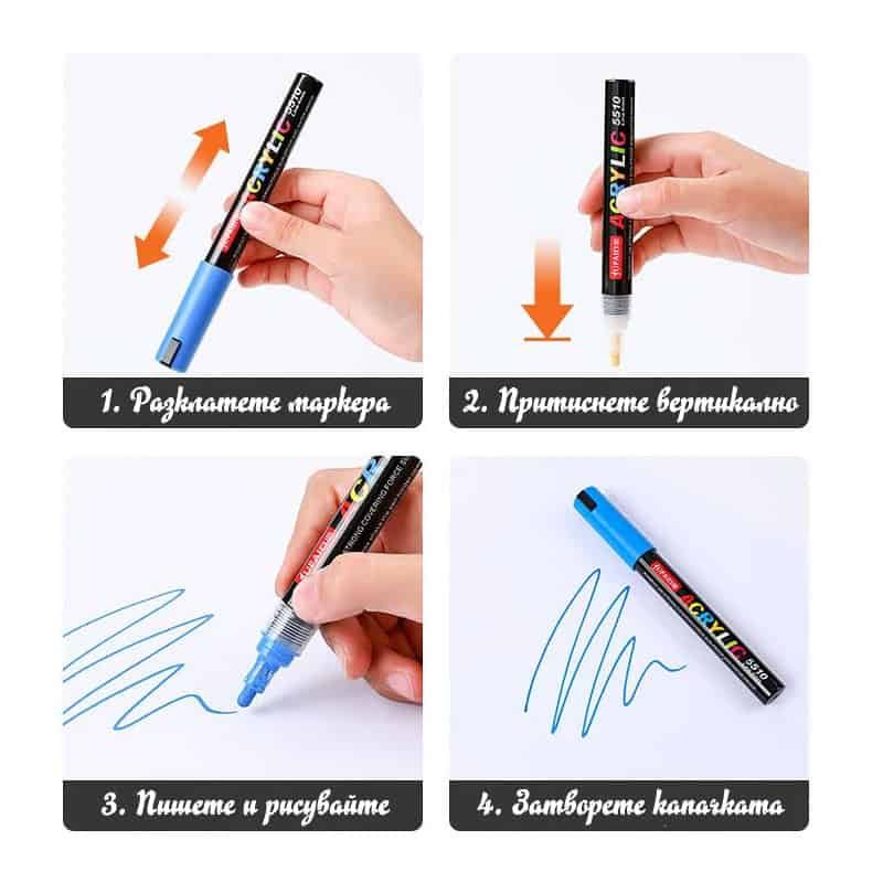 Професионални маркери с акрилна боя на водна основа. Дебелина на линията за писане 4 мм. Маркерите могат да се използват върху различни повърхности като хартия, плат, стъкло, керамика, дърво, метал и др. С покривната акрилна боя можете да рисувате дори върху черна хартия и пак ще се радвате на ярки и живи цветове. Чудесна идея за перфектен подарък! Този комплект маркери е подходящ за деца и любители на рисуването.