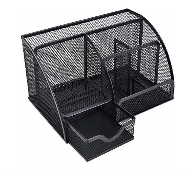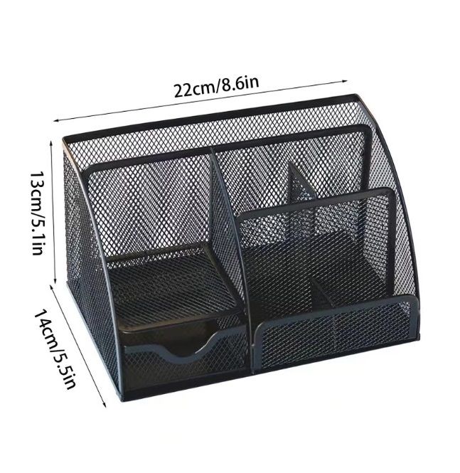 Мрежест органайзер за бюро, предназначен за съхранение на различни офис консумативи, подпомагащ поддържането на реда на работното място. С множество отделения с различни размери, включително чекмедже, за да побере химикалки, моливи, кламери, бележки и други дребни предмети.