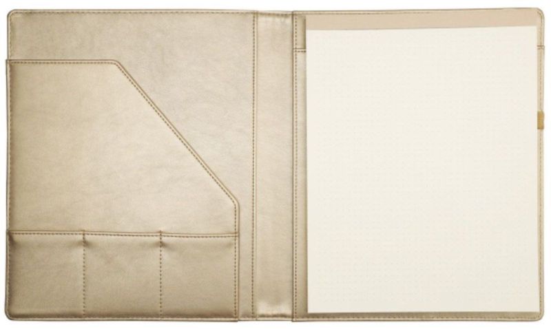 Удобна и стилна папка, оформена така, че да побира не само блокнот, но и допълнителни принадлежности: вътрешно покритие с текстура и джобове на кориците за визитки, бележки или листчета, както и място за химикалка – перфектна за записки в движение или за стилен бизнес аксесоар.