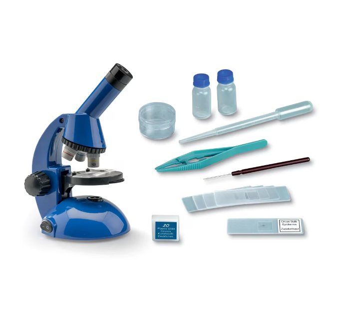 Комплектът съдържа: микроскоп, пинсета, игла, пипета, 2 контейнера за проби, 4 предметни стъкла, пластмасови предметни стъкла, постоянен образец на ципа от лук и блюдо Петри с капак.