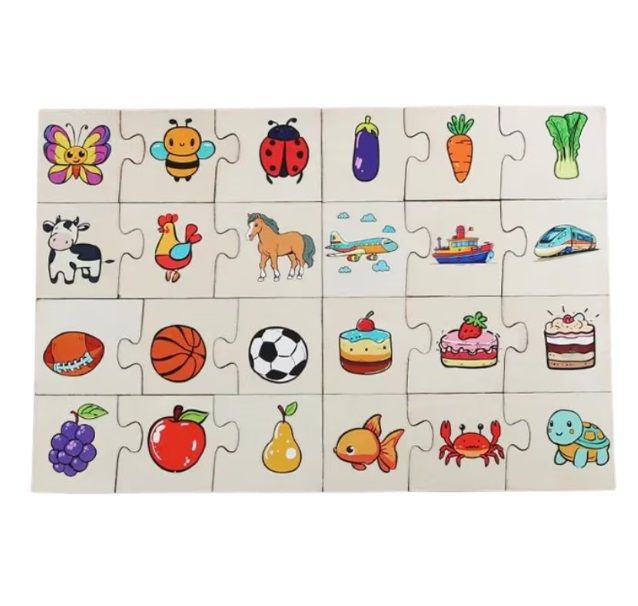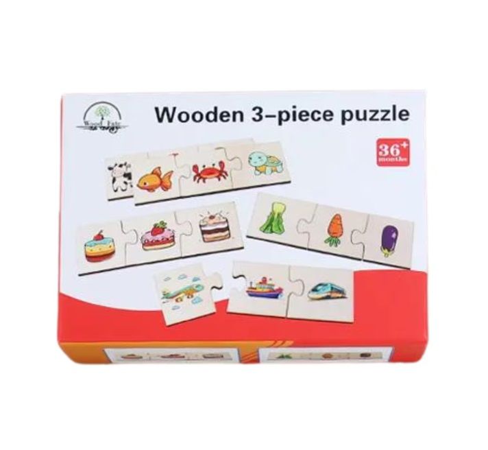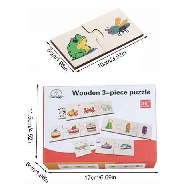 Комплектът включва няколко пъзела, всеки съставен от три части, които трябва да бъдат сглобени, за да образуват цяло логическо изображение. Отделните теми са пъзели с животни (крава, риба, рак, костенурка), сладкиши (тортички) и превозни средства (лодка, влак). Този тип пъзел помага за развитието на фината моторика, координацията око-ръка и уменията за решаване на проблеми при децата.