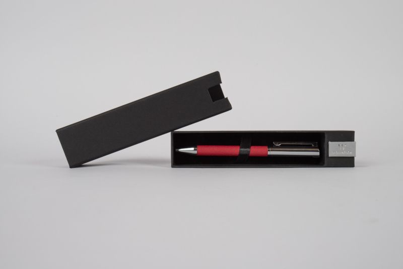 Метална химикалка в комбинация от червен и сребрист цвят. Синьопишеща, с дебелина на печата 0,5 мм. Пристига в подаръчна кутия, готова да изненада Вас или ваш близък.