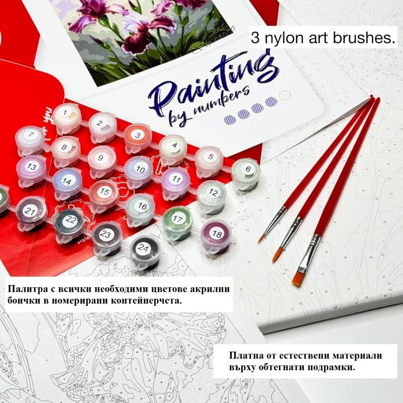 Създайте авторски шедьовър със собствените си ръце, дори ако работите с платно и бои за първи път. Комплектът с акрилни бои по номера е перфектен подарък, подходящ дори за най-малките. Просто е! Рисувате според номерираните контури, които съответстват на цвета на боята (номер в горната част на контейнера) и истинската картина ще започне да се появява. В комплекта са включени всички необходими материали: