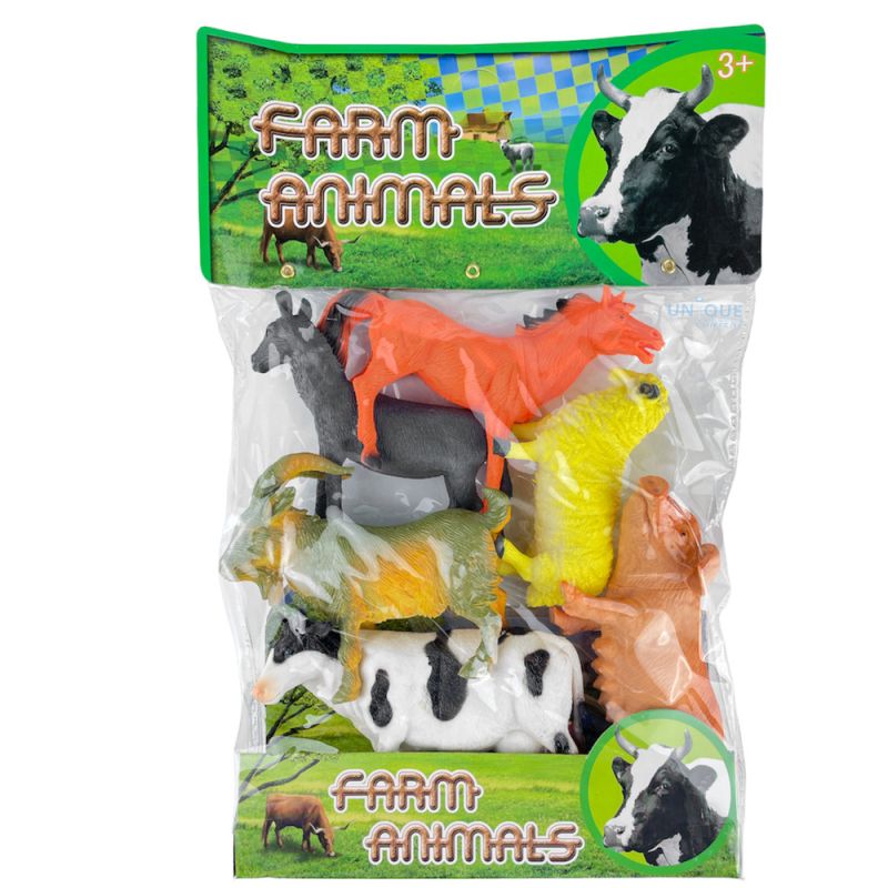 Комплект от 6 броя фигурки на селскостопански животни, сред които кон, крава, прасе и др. Подходящи са за деца над 3 години. Изработени са от пластмаса и са предназначени са за ролеви игри и образователни цели.