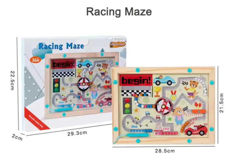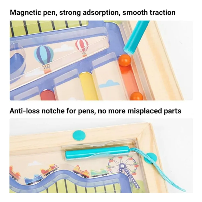 Дървеният лабиринт с магнитен молив на Noni & Co кани децата да изследват свят от цветове и движение, докато насочват топчетата по пътя си. Предлагат се различни модели, съчетаващи увеселителни паркове, динозаври и коли, превръщайки всяка игра в едно въображаемо приключение. Изработен от безопасна и издръжлива дървесина. С магнитен молив, който улеснява навигацията и стимулира фината моторика. Боядисан в ярки цветове, които да привличат вниманието на децата.