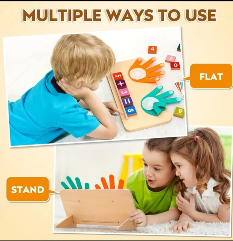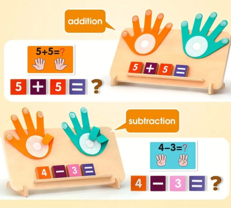 Монтесори дъска за броене с пръсти + 10 карти и 13 блокчета с числа. Комплект дървена образователна дъска Монтесори за ранно обучение. Включва дъска с пръсти за броене и дъска за писане на цифри. Предназначен е за развиване координацията око-ръка и фини двигателни умения. Включва различни карти с математически задачи за събиране и изваждане.