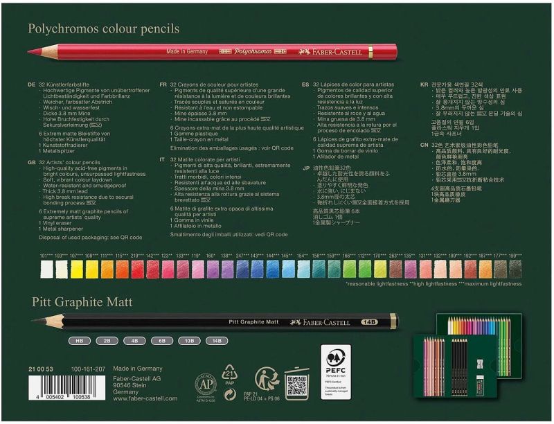 Комплект от 40 части в подаръчна кутия съдържа: 32 х цветни моливи Polychromos - 101, 103, 107, 108, 111, 115, 219, 142, 123, 133, 119, 160, 138, 247, 143, 144, 145, 154, 158, 159, 166, 112, 170, 263, 135, 131, 132, 189, 192, 187, 177, 199; 6 х графитни матови моливи Pitt Graphite Matt - НВ, 2В, 4В, 6В, 10В, 14В; 1 х метална острилка; 1 х гума.