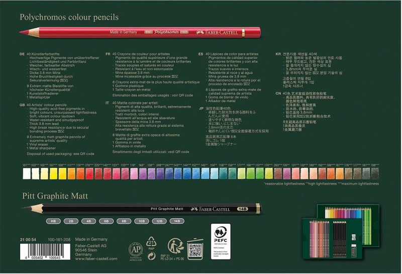 Комплект от 23 части в подаръчна кутия съдържа: 40 х цветни моливи Polychromos - 101, 103, 102, 107, 108, 111, 115, 219, 225, 142, 123, 133, 119, 160, 138, 249, 247, 143, 144, 152, 145, 154, 158, 159,171, 166, 112, 170, 263, 135, 131, 132, 189, 192, 188, 187, 176, 177, 181, 199; 8 х графитни матови моливи Pitt Graphite Matt - НВ, 2В, 4В, 6В, 8В, 10В, 12В, 14В; 1 х метална острилка; 1 х гума.